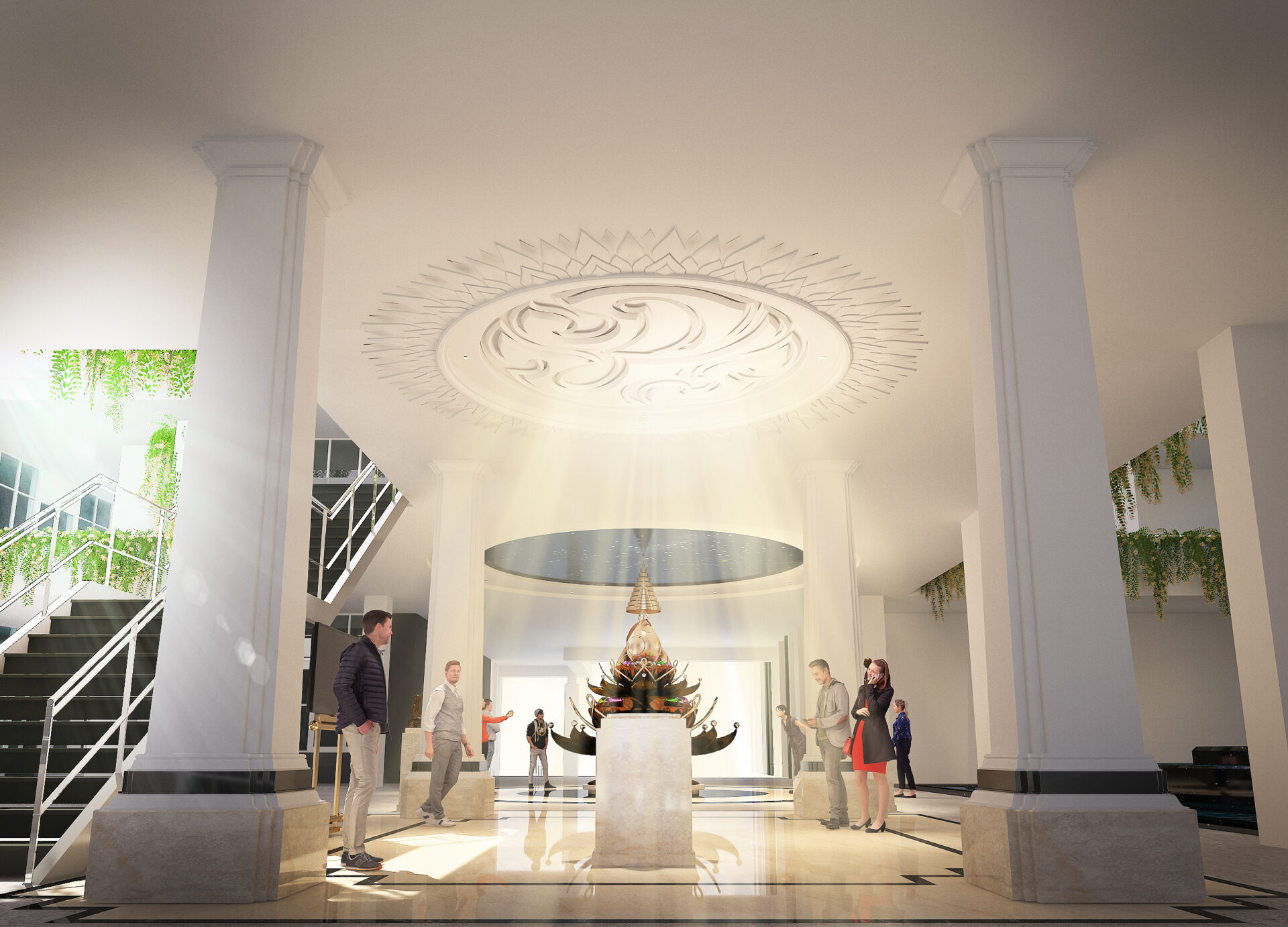 The sculpture titled “Chuti” (The Arrival) incorporates the form of the lotus flower as a symbol, representing the growth and flourishing of wisdom. The lotus is deeply connected to Thai Buddhists, as it has long been associated with purity and enlightenment in Buddhist teachings. This connection is especially significant because His Majesty King Bhumibol Adulyadej the Great was a devout Buddhist and governed according to the Ten Virtues of Kingship (Dasa Rajadhamma), embodying the principles of a righteous ruler (Dhammaraja) who brought peace and prosperity to his people throughout his reign.